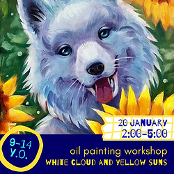 "White Cloud & Yellow Suns"- Oil Painting Workshop Ages 9-14 years 📍 VanGogh Campus — 64 Rosstown Road, Carnegie ⏰ 20 January 2:00-5:00 pm FOR KIDS Imagine a fluffy white dog — soft as a cloud and bright as a summer day — sitting proudly in a field of huge, glowing sunflowers. In this workshop, you’ll paint our adorable “White Cloud,” capturing the sunlight on his fur, the golden petals around him, and the peaceful, happy mood of a warm afternoon. You’ll learn how to build soft textures, blend sunshine tones, and paint petals that look like they’re glowing right off the canvas! FOR PARENTS This workshop introduces young artists to building light-filled compositions using oil paints. We’ll explore soft fur texture, warm–cool colour balance, and background layering to create depth in a floral setting. Students develop patience, brush control, and observational skills as they bring their cheerful dog portrait to life. It’s a heartwarming session — and even better when shared, so encourage your child to invite a friend and make it an afternoon full of creativity and sunshine. 📚 All materials included 🎟️ Limited spots — let your little artist’s imagination take flight! Join us NOW!